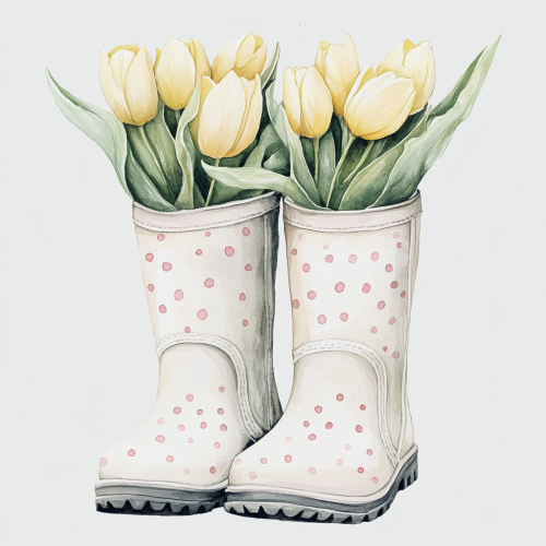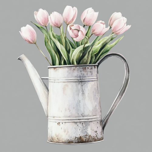 highly detailed watercolor clipart of a beautiful white metal watering can with pastel pink tulips, tulips inside and poking out, springtime feel, naturally composed composition, soft colors, luxurious aesthetics, beautiful illustration with realistic details, high resolution, gray background