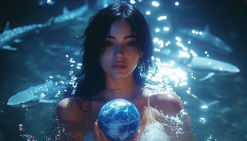 Brazilian woman with dress floating in water holding planet Earth, sharks floating aroundin tones of purples, photo-realistic, in the style of Canon EOS R5. --s 900 --sref 2813629345 --ar 114:65