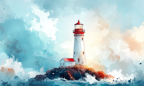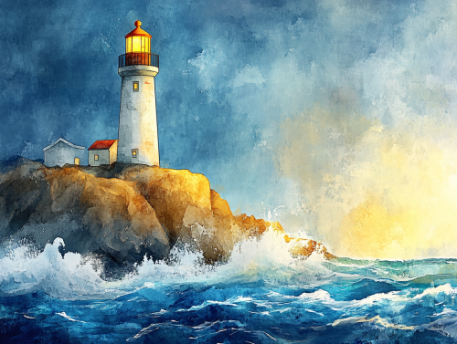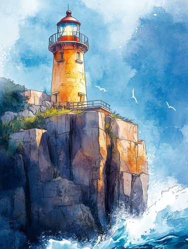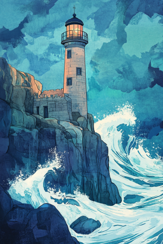 illustration for kids, a watercolor stain of An ancient lighthouse up close atop a cliff, its walls marked by scars, while sea waves crash strongly. Pixar style. ilustration for kids, flat style, cute, wellness, beautiful --ar 4:3 --stylize 200 --v 6.1