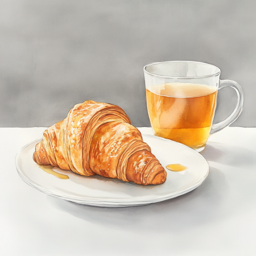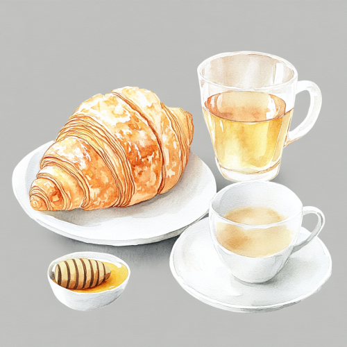 highly detailed watercolor clipart of a croissant on a white porcelain plate, next to a glass of honey and tea in a white porcelain mug, a touch of spring, naturally composed compositions, soft colors, luxurious aesthetics, beautiful illustrations with realistic details, high resolution, gray background