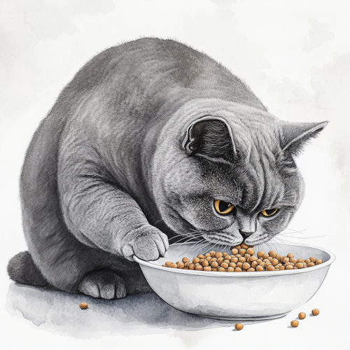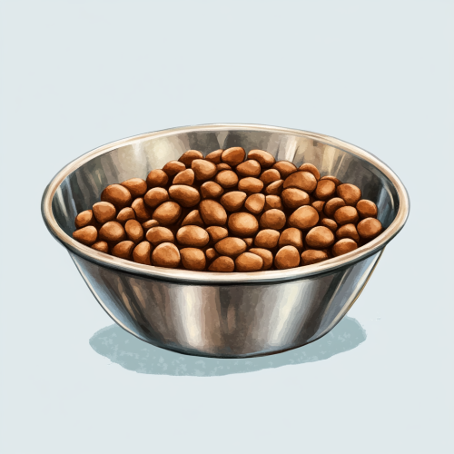 high detailed watercolor clipart beautiful metal bowl, full bowl of quality cat food, brown round granules, , cat bowl, luxury label, side view, beautiful illustration with realistic details, high resolution, gray background