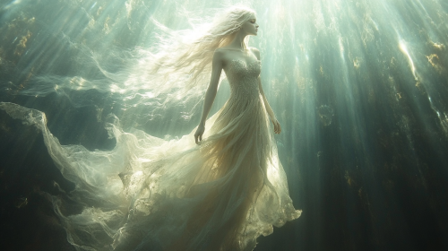 a female fairy floating with long silver hair and a beautiful dress, sun rays shining on her like she would stand in water, in the style of waterhouse, she is looking straight at the camera --ar 16:9 --stylize 350 --v 6.1