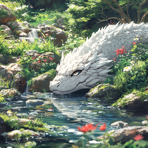 an image of a creature that is upper half man, lower half white serpent lying partially in the water on the banks of a spring. Semi realistic, anime style --s 750