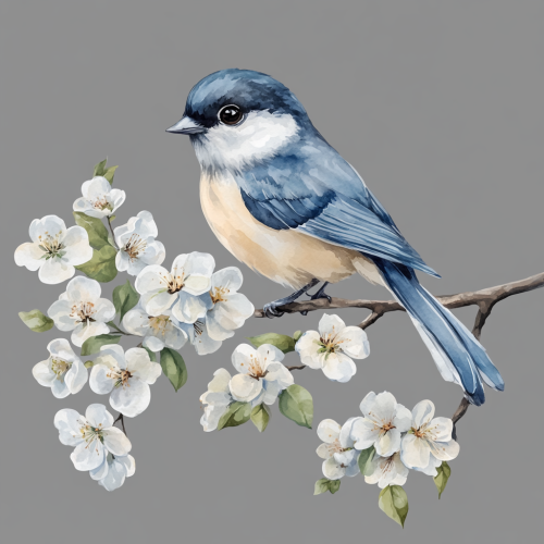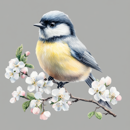 highly detailed watercolor clipart of a beautiful parus caerulaus in white-yellow and pastel pink, sitting on a blossoming branch with white flowers, a touch of spring, naturally composed composition, soft colors, luxurious aesthetics, beautiful illustration with realistic details, high resolution, gray background