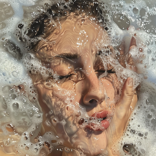 a photograph of a woman lying in the sea only hand and face are visible all the rest s covered with water realistic close up the water is a bit milky --v 6.0