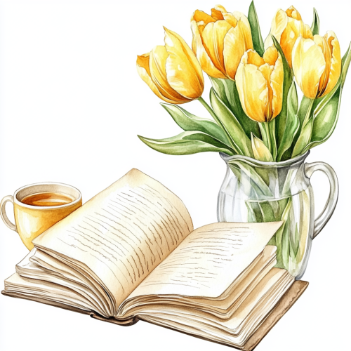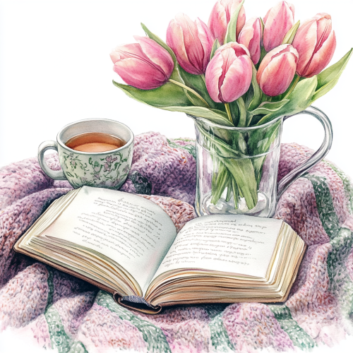 highly detailed watercolor clipart of a beautiful open journal book, next to it is a cup of tea in a mug and a glass vase with vibrant pastel pink tulips, on a spring blanket, naturally composed composition composition, soft colors, spring color palette, luxurious aesthetics, beautiful illustrations with realistic details, high resolution, white background