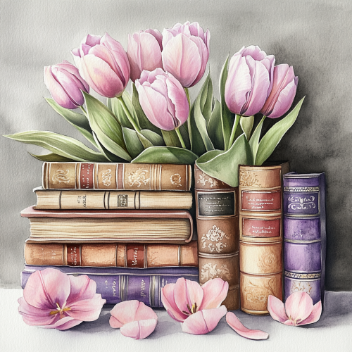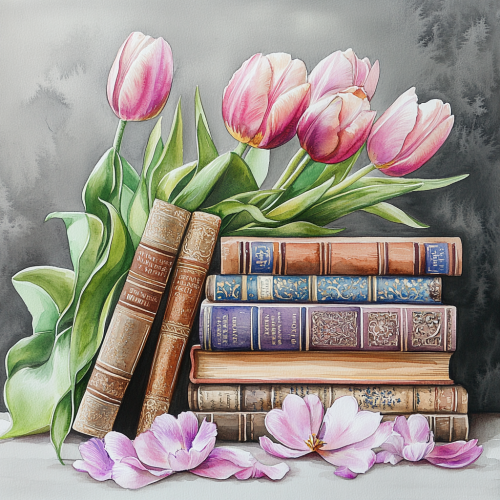 highly detailed watercolor clipart, a beautiful pile of books, stacked on top of each other, decorated covers, next to the books of the books are the petals of vibrant pastel pink tulips, naturally composed illustration, a touch of spring, soft colors, luxurious aesthetics, beautiful illustrations with realistic details, high resolution, gray background