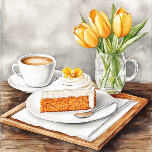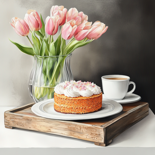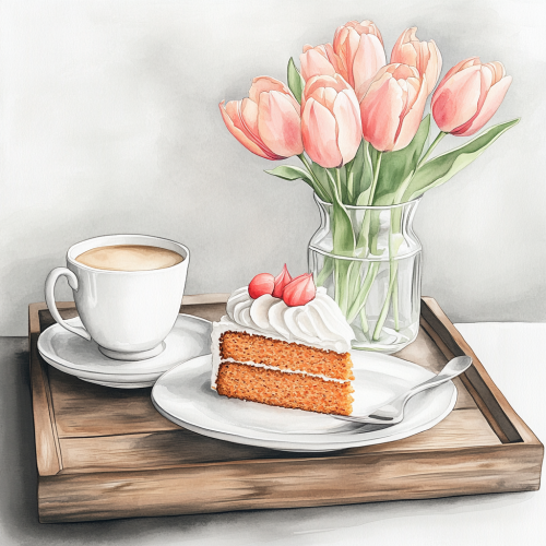 highly detailed watercolor clipart of a slice of carrot cake on a white plate, next to a fragrant coffee in a white cup and saucer, all on a beautiful wooden tray and a glass vase with vibrant pastel pink tulips, a touch of spring, naturally composed composition, soft colors, luxurious aesthetics, beautiful illustrations with realistic details, high resolution, gray background
