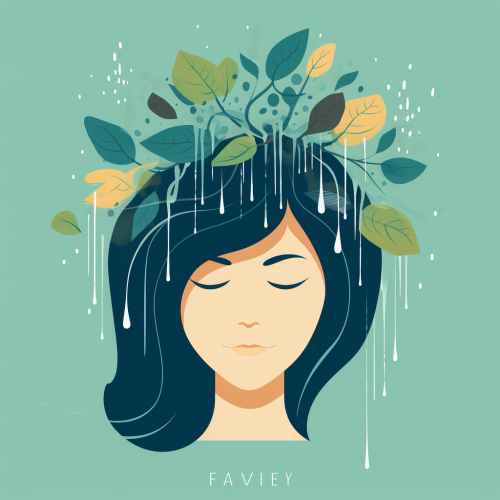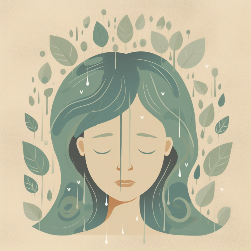 A clean and soft illustration showing a calm scalp with gentle flowing hair strands. Add icons of leaves and water droplets to signify hydration and balance. Use earthy tones like soft green and beige for a natural, gentle feel. --v 5.0 --ar 1:1