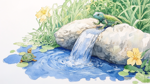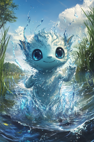 magic the gathering art style, D&D character style, thin body, tall body, a cute baby water elemental, in a lake, tall wave in the background, blue sky, --ar 2:3