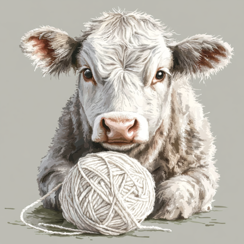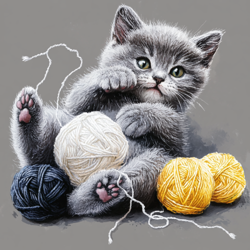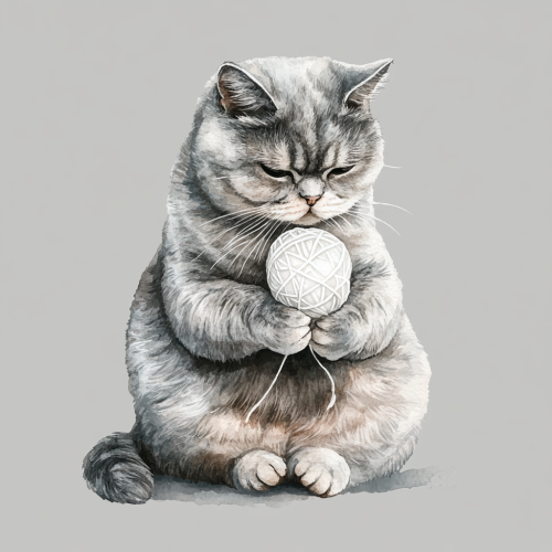 high detailed watercolor clipart of a beautiful fat gray British cat, sitting, playing with a ball of white yarn, luxurious aesthetics, cow, beautiful illustration with realistic details, high resolution, gray background