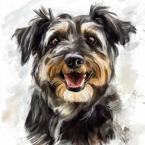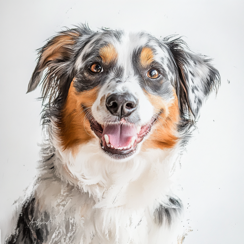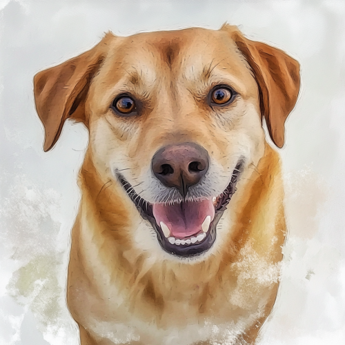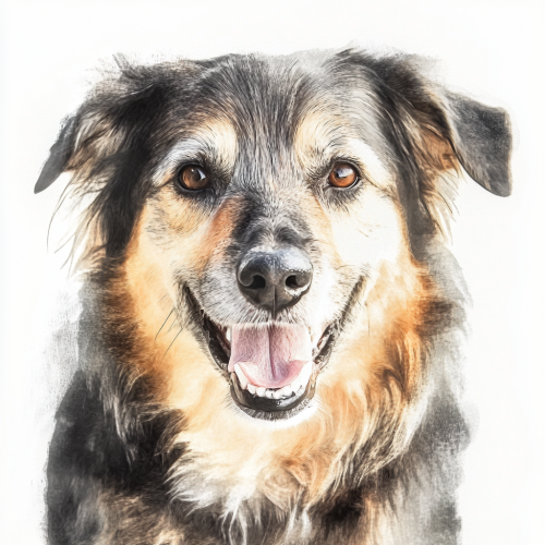 closeup watercolor dry brush sketch in abstract long brush strokes of an adult dog smiling looking straight at the camera, with a white background --s 50