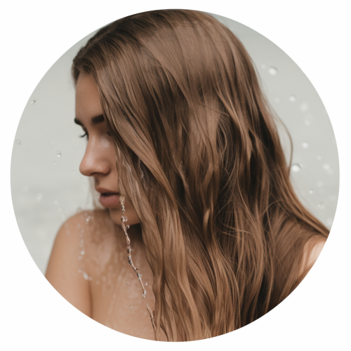 A clean and soft showing a calm scalp with gentle flowing long hair strands. Add icons of leaves and water droplets to signify hydration and balance. Use earthy tones for a natural, gentle feel. --v 5.0 --ar 1:1