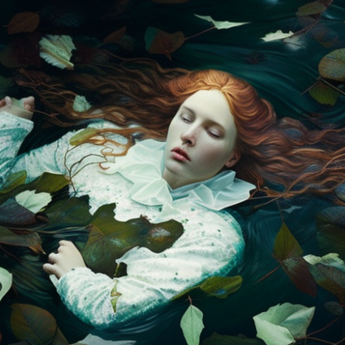 in a Pre-Raphaelite fashion, exact pose as woman in a foaming River, with little lilies and fallen leaves. Extremely realistic, hyper realistic. --v 4 --upbeta