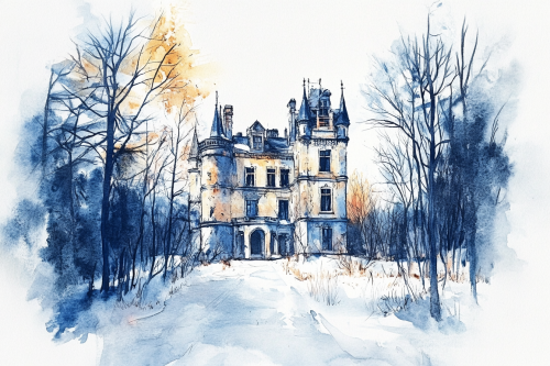 Watercolor painting of an abandoned old castle estate surrounded by trees in winter, with blue and yellow colors, snow on the ground and a white background, --ar 3:2 --v 6.1