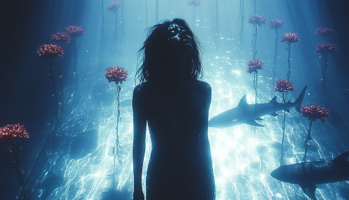 Brazilian woman with dress floating in waterwith casted shadows from flowers, sharks floating aroundin tones of purples, photo-realistic, in the style of Canon EOS R5. --s 900 --sref 2813629345 --ar 114:65