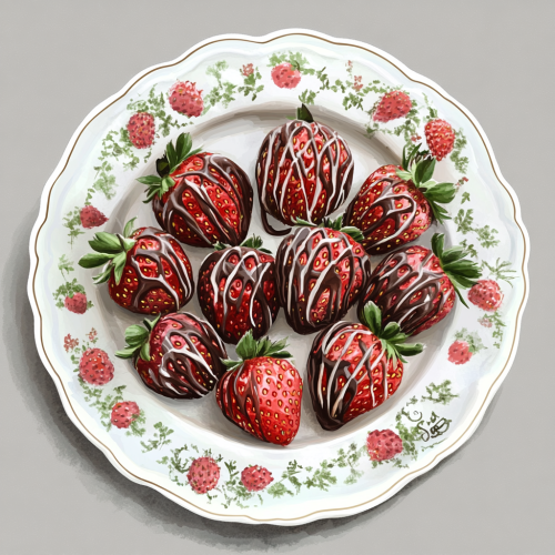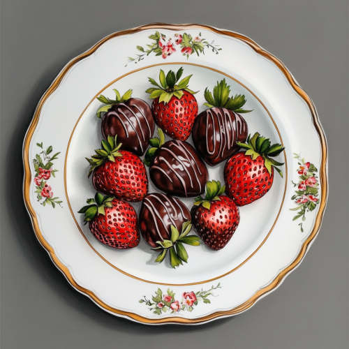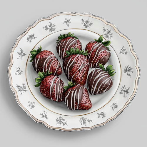 highly detailed photorealistic watercolor of multiple strawberries covered in chocolate, on a beautiful white porcelain dessert plate, elegant and sophisticated, naturally composed composition, beautiful illustration with realistic details, high resolution, gray background