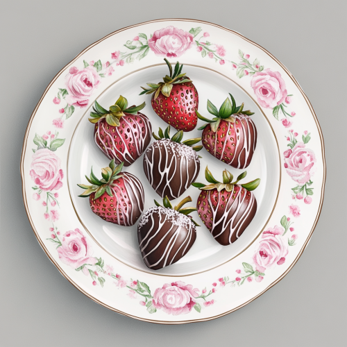 highly detailed watercolor clipart of multiple strawberries covered in chocolate, on a beautiful white porcelain dessert plate with delicate delicate romantic ornaments in pastel pink, elegant and sophisticated, naturally composed composition, beautiful illustration with realistic details, high resolution, gray background
