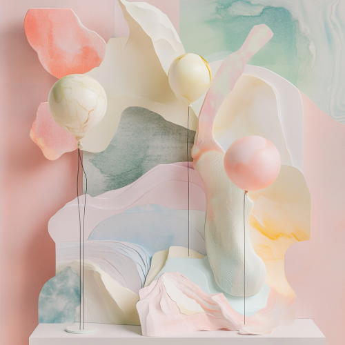 Design a portfolio cover for Elaine Lo, an aspiring design student applying to art schools like Parsons and Art Center. Create a soft, dreamy 3D mixed-media cover using gentle watercolor textures blended with pastel colors. Incorporate floating, semi-translucent 3D balloon models that add a light, playful dimension. Arrange abstract shapes and layered elements with fluid gradients and organic curves, maintaining an ethereal, modern feel. The cover should evoke creativity and elegance without any human faces, emphasizing a gentle, imaginative aesthetic