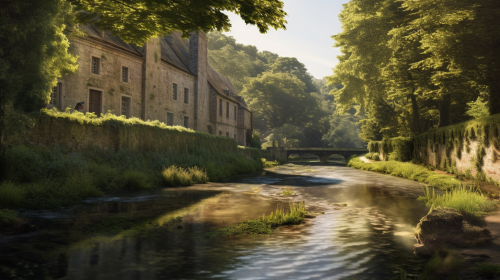 A highly detailed, ultra-realistic landscape of the Esch-sur-Sûre river in Luxembourg during early morning, showing intricate textures on the calm water surface, with subtle ripples reflecting the lush green trees and stone buildings along the riverbank. The scene captures fine details of moss growing on ancient stone walls, cracked and weathered stone textures, realistic shadows cast by the morning sun. The soft mist hovering over the water diffuses the golden sunlight, creating a dreamy, photorealistic glow on the surface of the river. Each leaf on the trees is individually detailed, with some leaves casting soft shadows onto others, while others show slight imperfections from the effects of weather. The riverbank is lined with wet pebbles and rocks, their surfaces glistening with moisture. The foreground includes hyper-detailed blades of grass, showing tiny dew droplets on each blade, and small flowers adding a pop of color, while in the background, the old stone bridge reflects on the river with perfect symmetry, the reflection distorted slightly by the subtle movement of the water. The distant hills are covered in dense forest, each tree rendered with high-resolution textures, bark detail, and different shades of green from the morning sunlight. In the sky, a few birds soar with highly realistic feather detail, their shadows barely visible on the water’s surface. The lighting is cinematic, with a soft, golden hue from the sunrise illuminating the scene with high dynamic range (HDR), capturing every texture from the rough stone to the smooth ripples of the river. Light fog in the distance adds atmospheric depth. Photorealistic reflections and refractions in the water, ultra-detailed shading on the stones, and fine light scattering in the mist create an almost [...]