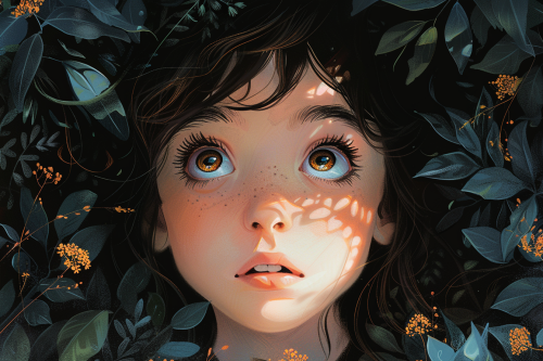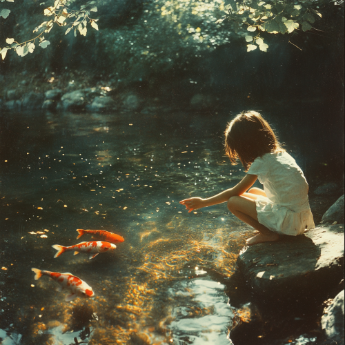 a very realistic photo of a 10 years old girl, squats on a stone near the river. She puts the top of her fingers into the water of her left hand and reaches to the koi carp in the water. The sunlight shines through the leafs of the oaktree. We see sunspots on the ground. We see the girl form the back so she looks away from the viewer. It's a close picture. The colurs are very Dutch colours. Cool green and cool blue- @Marieh (fast) Image
