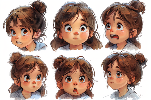 A six-panel collage for a children's book illustration. Traditional children's book illustration style, with the charm of Beatrix Potter and the expressive lines of Quentin Blake. Karina, my adorable six-year-old character with big brown eyes and wavy brown hair, exploring a white background, with a different expression in each frame (curious, surprised, delighted, playful, thoughtful, joyful). Varying compositions, close-ups, and wider shots. Line art with flat colors, watercolor textures, defined outlines, and a limited color palette of pastel reds, pinks, blues, and greens. --ar 3:2 --v 6.0 --s 750