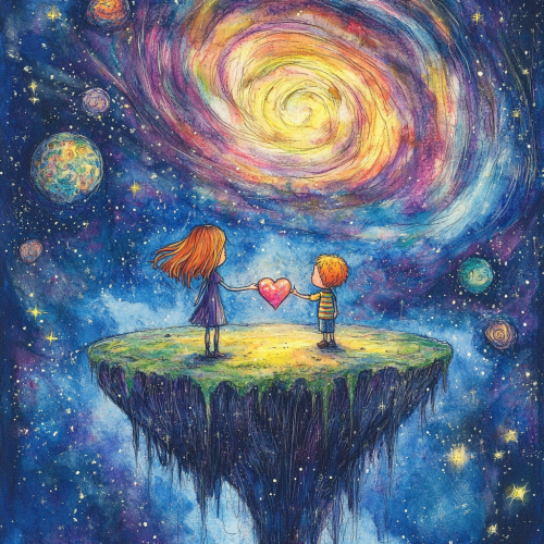 childrens book illustration , pencil , water color , hand drawn , sketchy , Luna and Sol stand on their floating island once again, holding the Heart of Truth. The universe around them is glowing and vibrant, with stars twinkling brightly and galaxies swirling with color. The once-darkened cosmos is now filled with light, and distant planets, comets, and constellations are shining. The children look peaceful and proud, knowing they’ve restored balance to the universe.