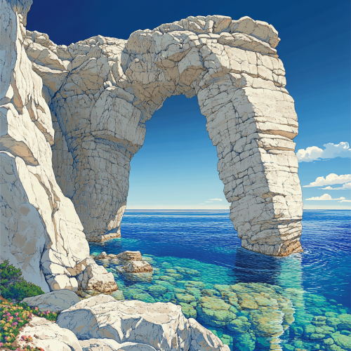Create a detailed illustration of S'Archittu, the iconic natural limestone arch on the Sardinian coastline. Focus on the rugged texture of the rock formation, capturing the intricate details of the eroded surface, cracks, and layers. The arch should stand prominently over the calm, crystal-clear waters of the Mediterranean, with gentle waves lapping against the base. Include the surrounding cliffs and coastal landscape, using shades of soft white and beige for the limestone, contrasting with the deep blue and turquoise hues of the sea. The sky should be clear and vibrant, with subtle gradients to reflect the warm, sunny Mediterranean atmosphere. Add fine details to convey the natural beauty of this unique landmark, including small plants or marine life around the base of the arch for added realism.