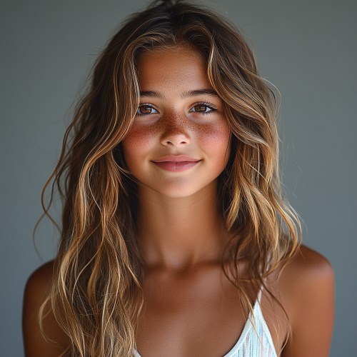 A realistic, high-resolution studio photograph of a teenage girl (12-16 years old) with wavy brown hair and brown eyes, smiling gently. She stands on a surf board, centered in the frame. The background is a clean, plain studio backdrop with soft, even lighting that highlights her friendly expression and natural features. Photographic quality, realistic skin texture, soft shadows, minimal post-processing. Full standing photo --s 750