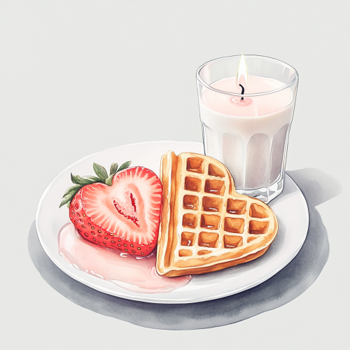 highly detailed watercolor clipart of a heart-shaped waffle next to a strawberry sliced waffle, on a porcelain white plate, a glass of milk next to the plate and a pastel pink candle next to the milk, naturally composed composition, soft colors, luxurious aesthetics, beautiful illustrations with realistic details, high resolution, gray background