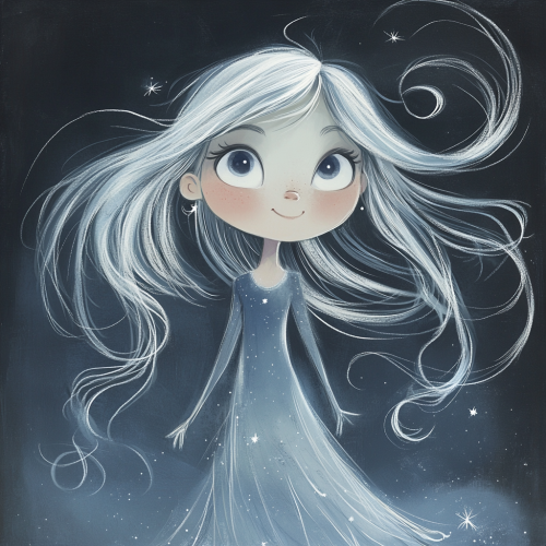 childrens book illustration , pencil , water color , hand drawn , sketchy , young girl, around 8 years old, with an ethereal, glowing appearance. She has flowing silver hair that seems to float slightly around her, giving the illusion of weightlessness. Her eyes are large, soft, and silvery-white, twinkling like stars. Her skin has a pale, moonlit glow, almost translucent, with soft gradients of lavender and blue reflecting her celestial origin. She wears a flowing, slightly futuristic dress made of a light, silky material that shimmers with stars. The edges of her dress have subtle glowing constellations woven into the fabric, which change as she moves. Her accessories include small, crescent-moon-shaped earrings and glowing star bracelets that emit a gentle, magical light. Luna’s overall vibe is graceful, whimsical, and dream-like, but with a hint of cuteness and curiosity in her expressions.